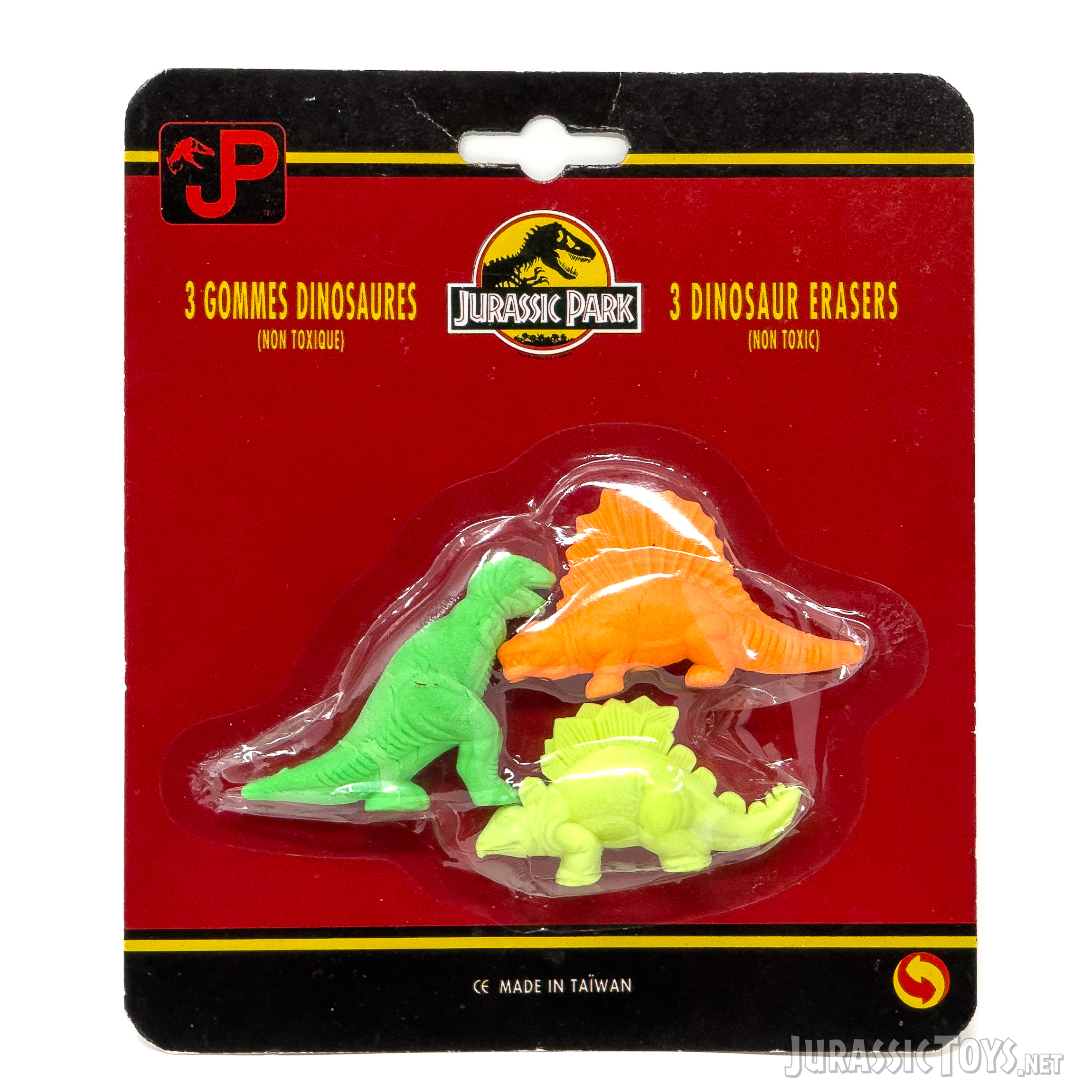 Vintage non-toxic dinosaur eraser set presented in unconventional Jurassic Park–style packaging. The set includes a Dimetrodon, Tyrannosaurus rex, and Stegosaurus.