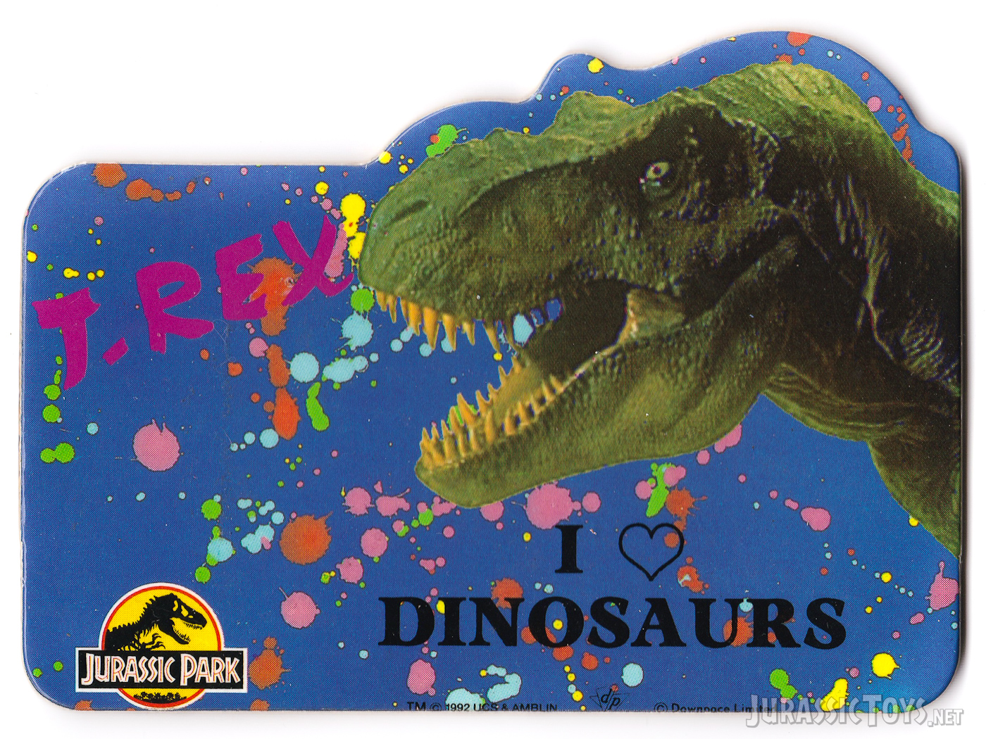 Produced in 1993 by Downpace Limited in the UK, these brightly colored Jurassic Park door plates were part line of novelty Jurassic Park items. Each plate features artwork and a slogan, combining playful humor with vivid character artwork. The series captures the height of Jurassic Park’s early merchandising boom and remains a nostalgic example of 1990s giftware design.