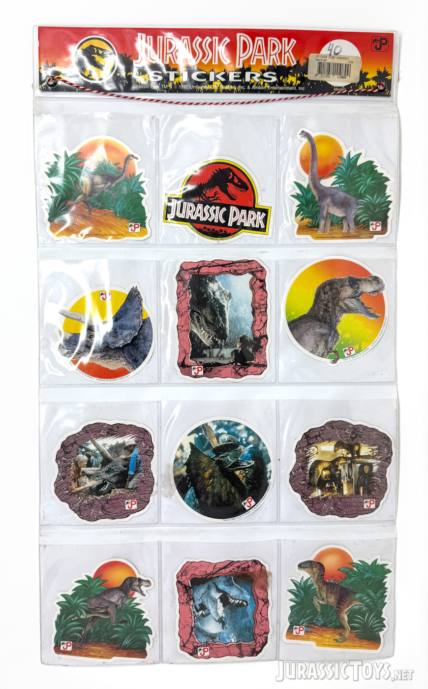 This large display holds a complete set of Jurassic Park stickers produced in 1993 by Introduct IJsselstein for the Dutch market. Featuring twelve die-cut vinyl stickers, the set includes both stylized dinosaur artwork and film stills, all individually tucked in clear plastic sleeves.