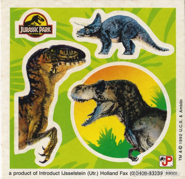 This bright green sticker sheet by Introduct Ijsselstein features a bold, jungle-inspired layout with three key dinosaur characters from Jurassic Park: Tyrannosaurus rex, Triceratops, and a menacing Velociraptor. Each sticker is die-cut and stylized with a glossy photo finish, capturing the 1990s aesthetic of realism-meets-toy design. The prominent Jurassic Park logo anchors the top left corner, while the color palette evokes the lush environment of Isla Nublar.