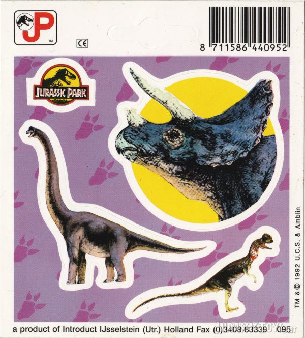 This compact Jurassic Park sticker sheet, produced in 1993 by Introduct IJsselstein, features a purple background accented with subtle dino footprints and three bold die-cut dinosaur stickers. The featured creatures—Triceratops, Brachiosaurus, and a Velociraptor—are rendered in richly detailed illustrations, with the Triceratops prominently framed by a bright yellow circle. The official Jurassic Park logo sits in the top left, and the retail-style backing includes a barcode and hanger tab, as these were sold individually in shops. As with other Introduct products, this sheet is a uniquely regional collectible, officially licensed by Universal and Amblin for the European market.