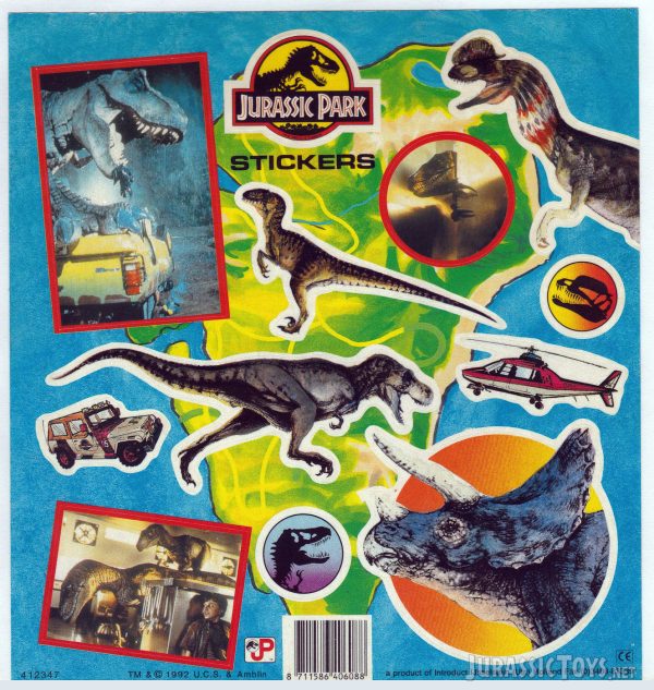 This square-format sticker showcases a mix of action-packed film stills and stylized dinosaur graphics on a bright blue background featuring Isla Nublar. Including species like the Velociraptor, Dilophosaurus, and Tyrannosaurus rex, it also features bold circular logo stickers and miniature scenes from the original 1993 movie. The playful composition and punchy design reflect the vibrant aesthetic typical of early ‘90s merchandising, with Introduct’s local Dutch production making it a rare and regionally unique item in the global Jurassic Park memorabilia landscape.