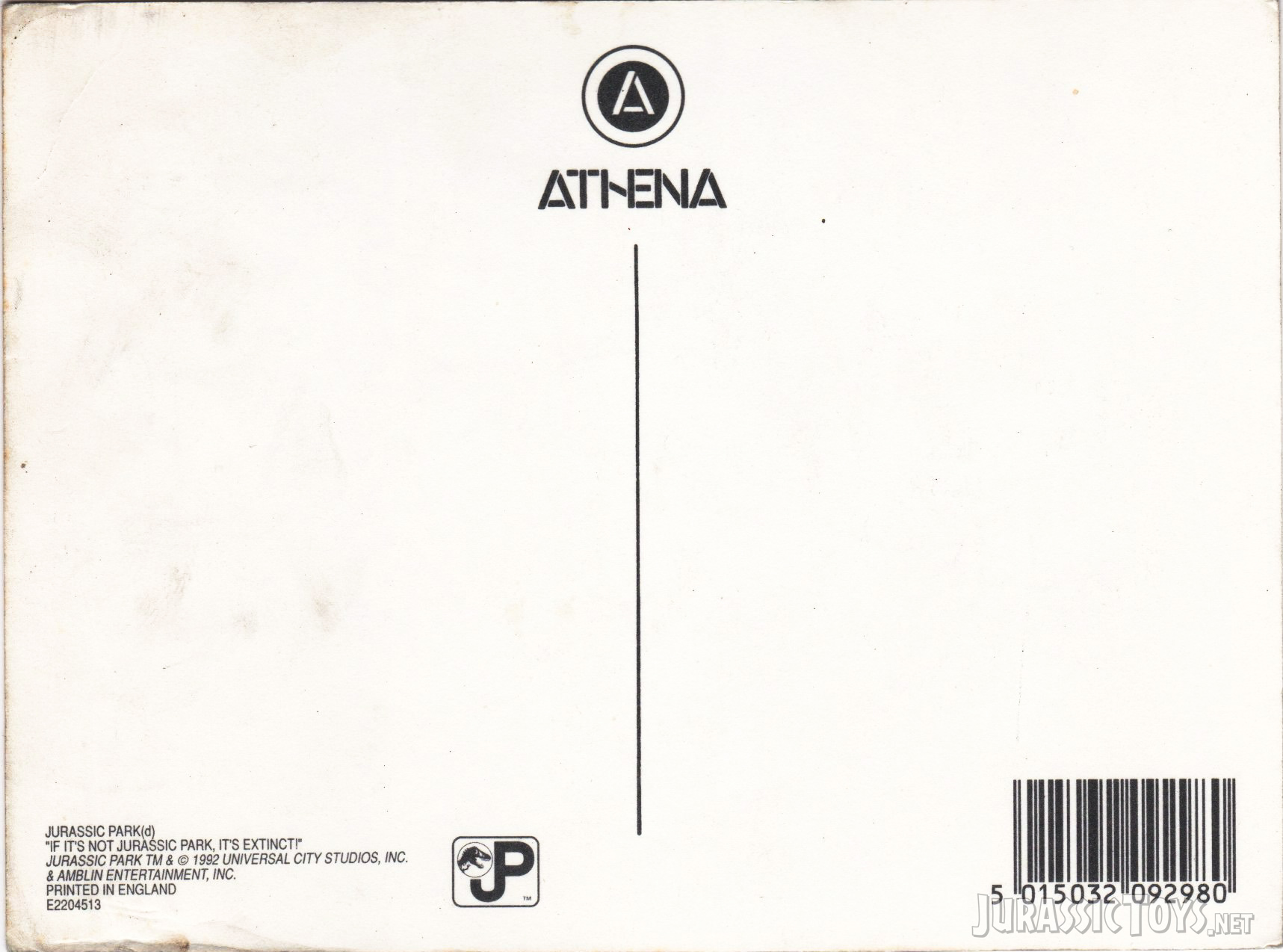 This vintage 1993 Jurassic Park postcard, produced by Athena International and printed in England. It features an official licensed publicity still showcasing the Jurassic Park Dilophosaurus.