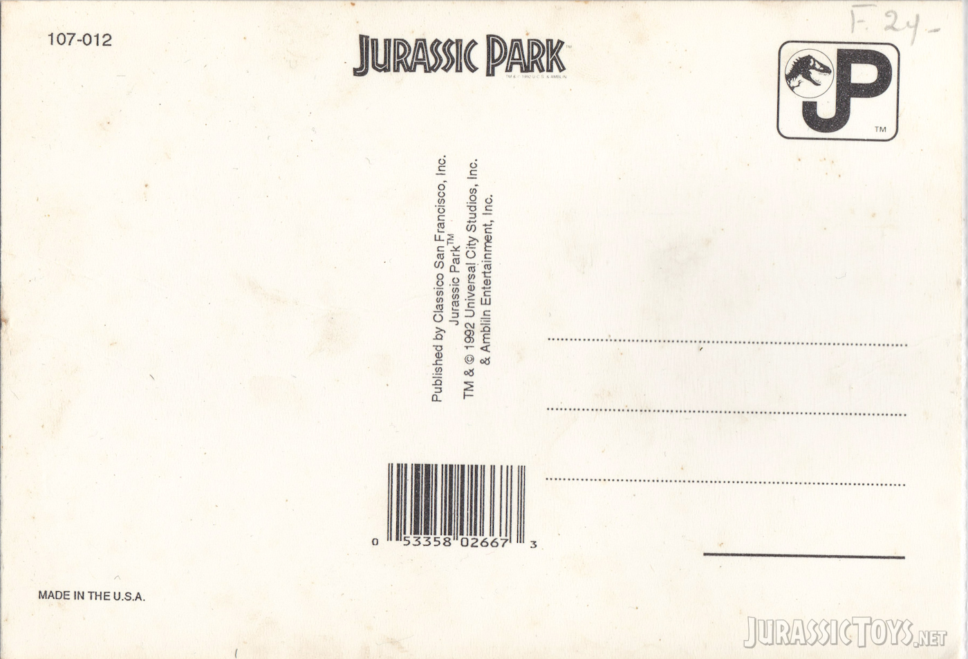 Classico San Francisco, Inc. was a postcard manufacturer active from the 1970s through the early 2000s, known for producing licensed postcards featuring imagery from popular films—including Jurassic Park. With official permission to use copyrighted materials, the company released a series of postcards showcasing memorable scenes and characters from the 1993 blockbuster. Today, these cards are considered collectible pieces of Jurassic Park history, capturing the film’s visual legacy in a uniquely printed format.