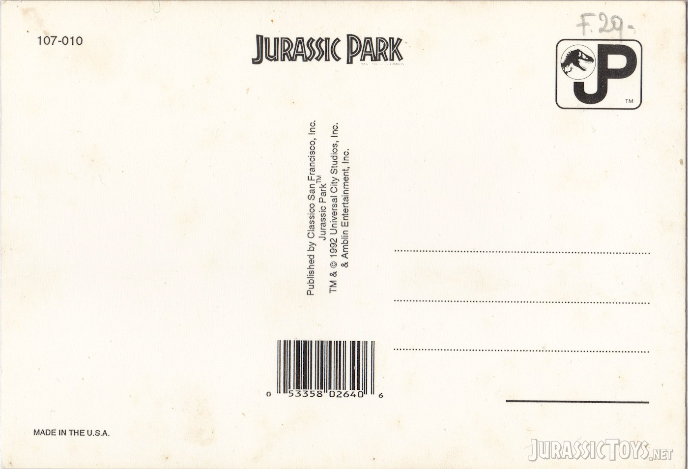 Classico San Francisco, Inc. was a postcard manufacturer active from the 1970s through the early 2000s, known for producing licensed postcards featuring imagery from popular films—including Jurassic Park. With official permission to use copyrighted materials, the company released a series of postcards showcasing memorable scenes and characters from the 1993 blockbuster. Today, these cards are considered collectible pieces of Jurassic Park history, capturing the film’s visual legacy in a uniquely printed format.