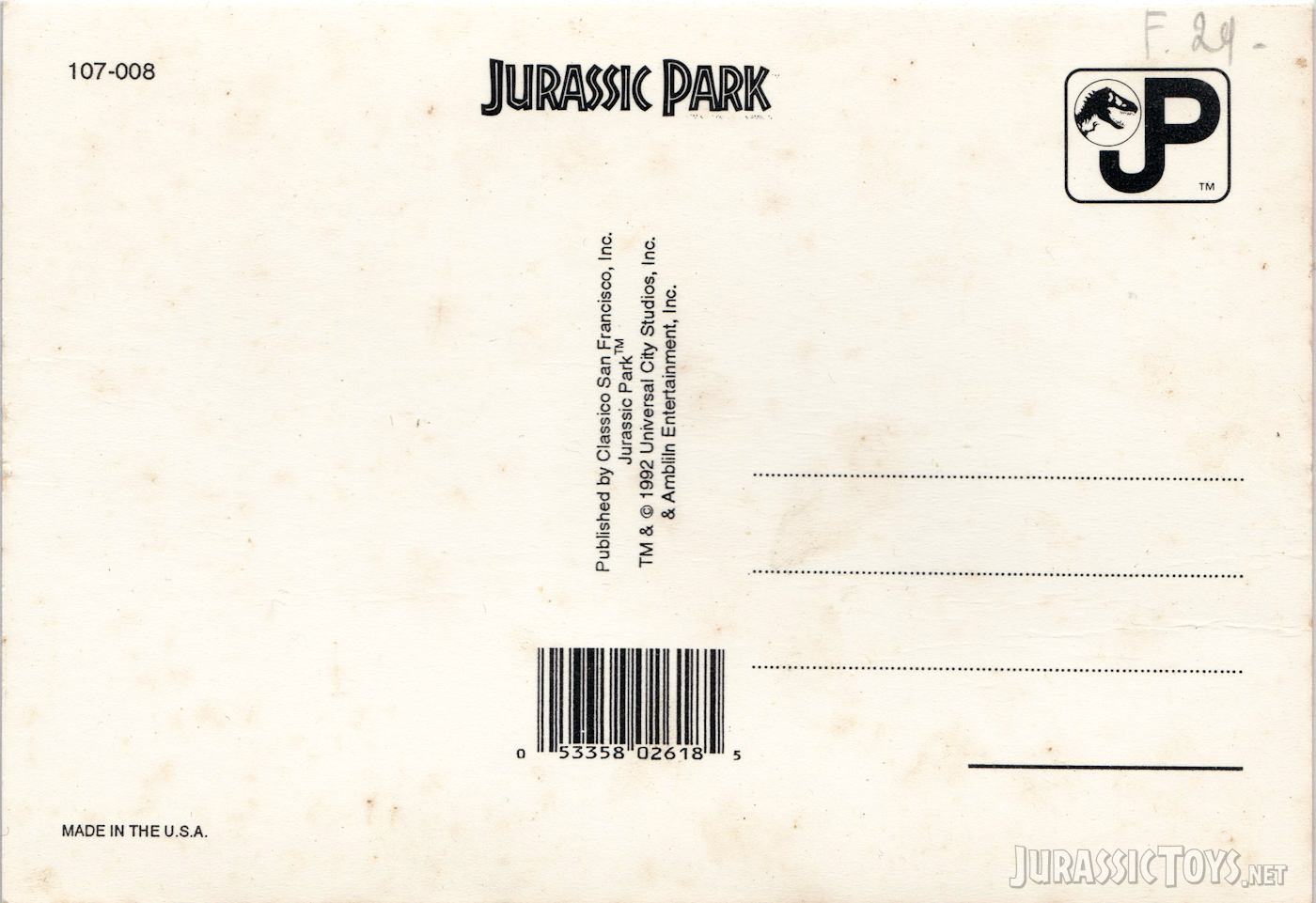 Classico San Francisco, Inc. was a postcard manufacturer active from the 1970s through the early 2000s, known for producing licensed postcards featuring imagery from popular films—including Jurassic Park. With official permission to use copyrighted materials, the company released a series of postcards showcasing memorable scenes and characters from the 1993 blockbuster. Today, these cards are considered collectible pieces of Jurassic Park history, capturing the film’s visual legacy in a uniquely printed format.
