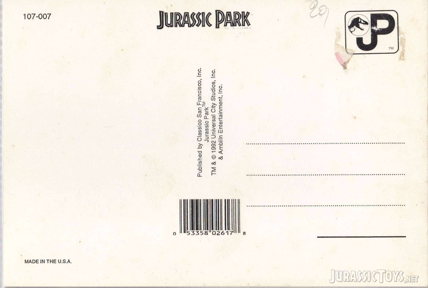 Classico San Francisco, Inc. was a postcard manufacturer active from the 1970s through the early 2000s, known for producing licensed postcards featuring imagery from popular films—including Jurassic Park. With official permission to use copyrighted materials, the company released a series of postcards showcasing memorable scenes and characters from the 1993 blockbuster. Today, these cards are considered collectible pieces of Jurassic Park history, capturing the film’s visual legacy in a uniquely printed format.