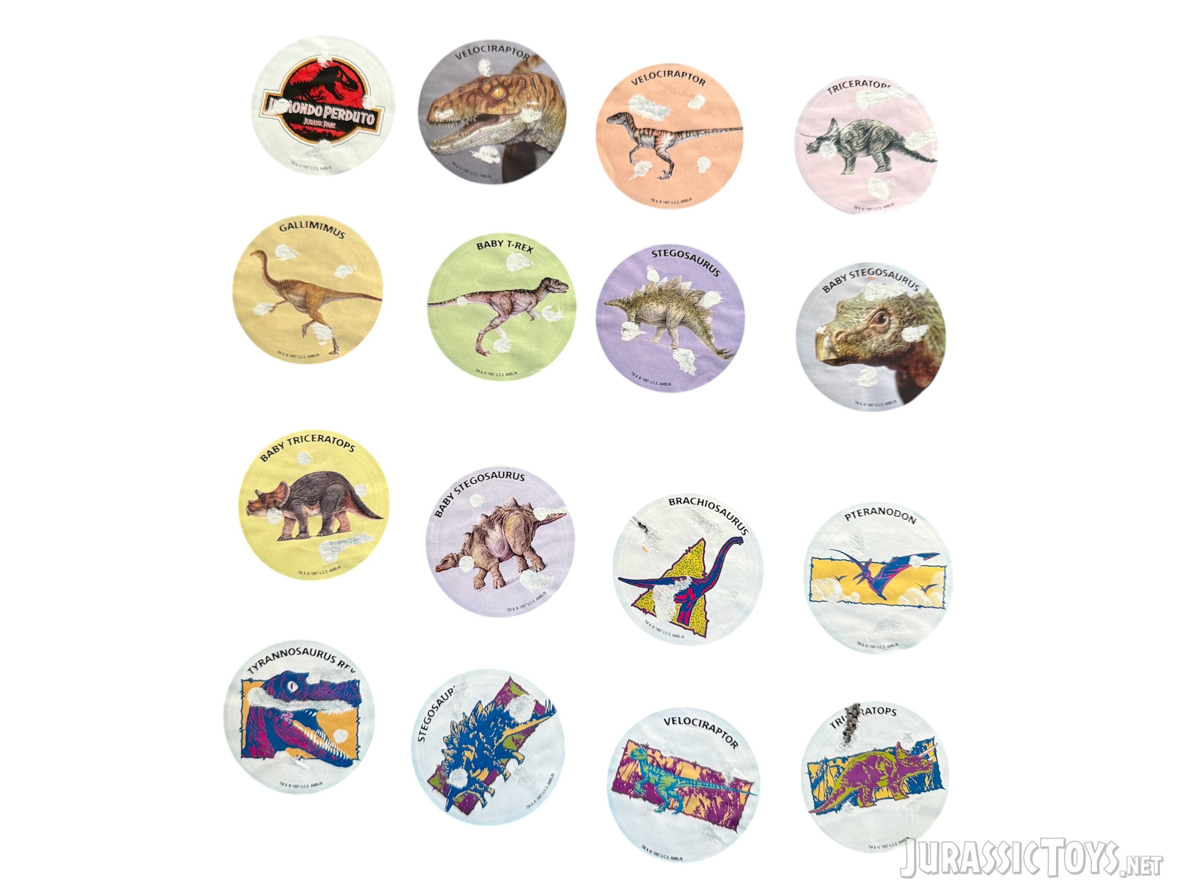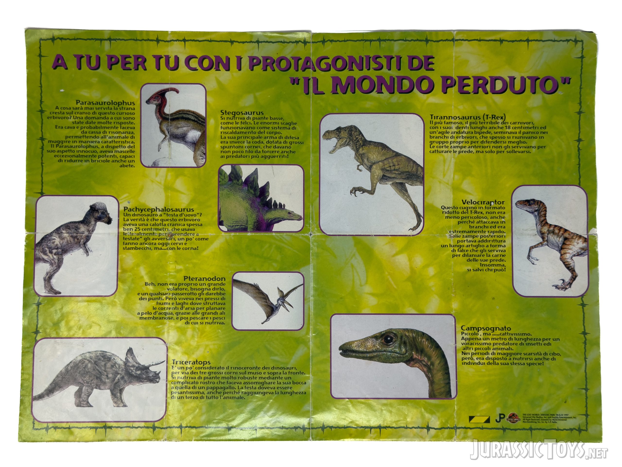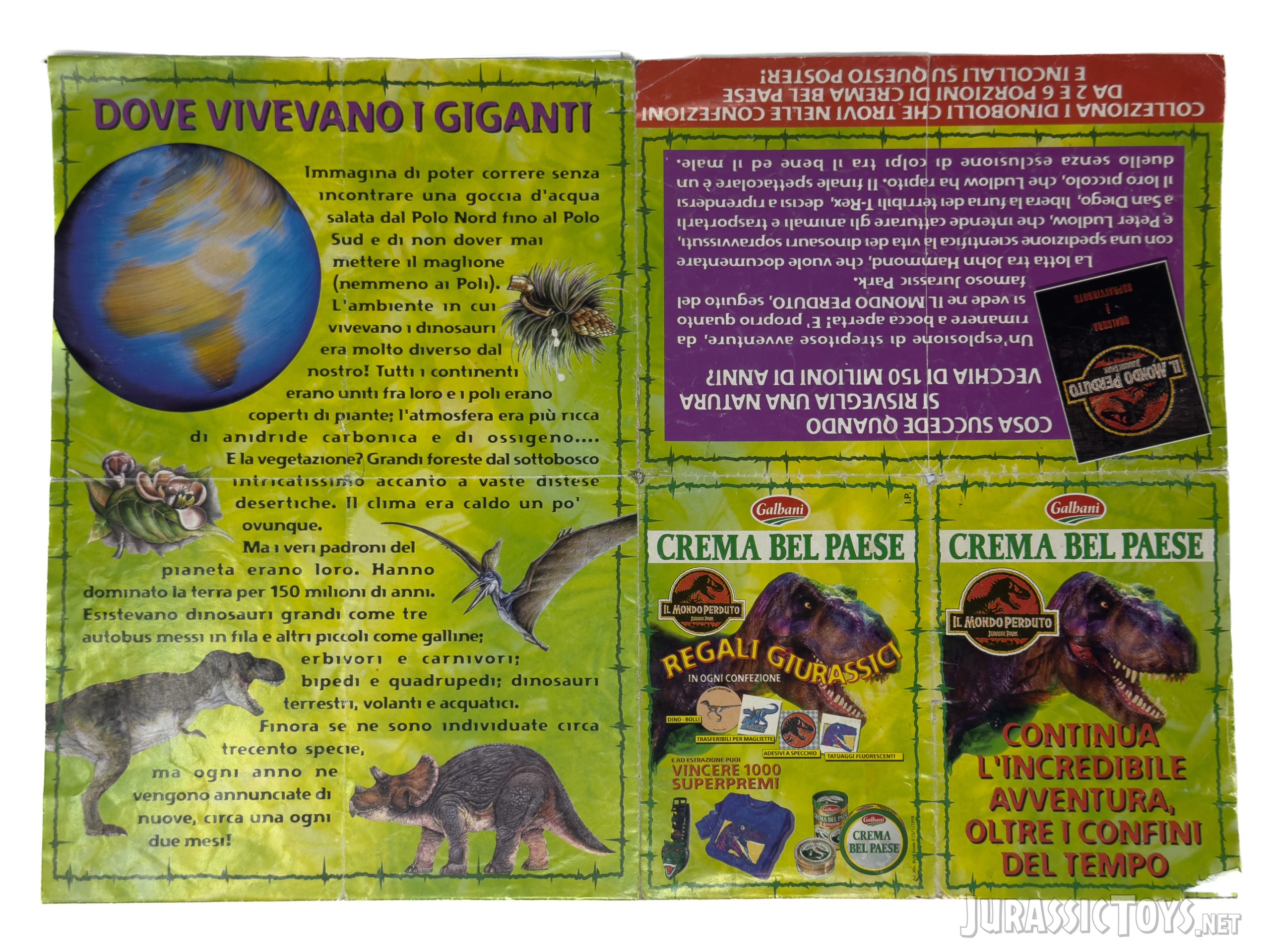 Released in Italy in 1993, this “Il Mondo Perduto: Jurassic Park” poster was part of a major Galbani Crema Bel Paese promotion tied to the original Jurassic Park film. Distributed as a free insert with Topolino (Mickey Mouse) magazine, the poster combined play, education, and brand marketing: the front featured a large Jurassic Park–themed layout where children could complete the scene by gluing round dinosaur stickers collected from the reverse side of Crema Bel Paese mozzarella labels, while the back of the poster offered illustrated, kid-friendly educational text about dinosaurs, their habitats, climate, and evolution, under the headline “Dove vivevano i giganti” (“Where the giants lived”). Blending collectible food packaging, movie artwork, and prehistoric learning, this interactive poster is a classic example of early-1990s Jurassic Park merchandising in Europe and a nostalgic survivor of a uniquely hands-on promotional era.