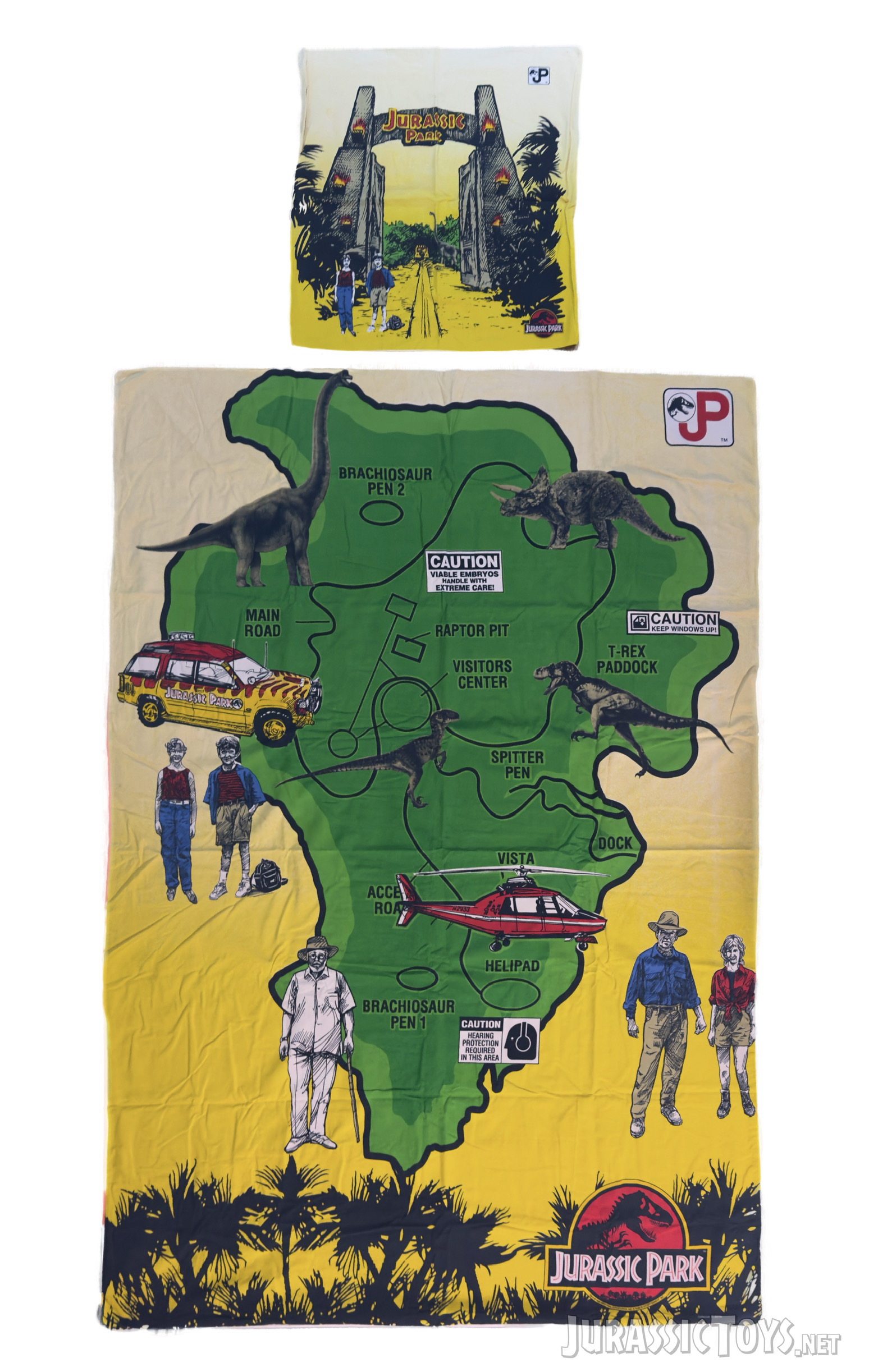 This 1993 duvet cover lays out a stylised map of Isla Nublar, populated with key dinosaurs and familiar faces from Jurassic Park.