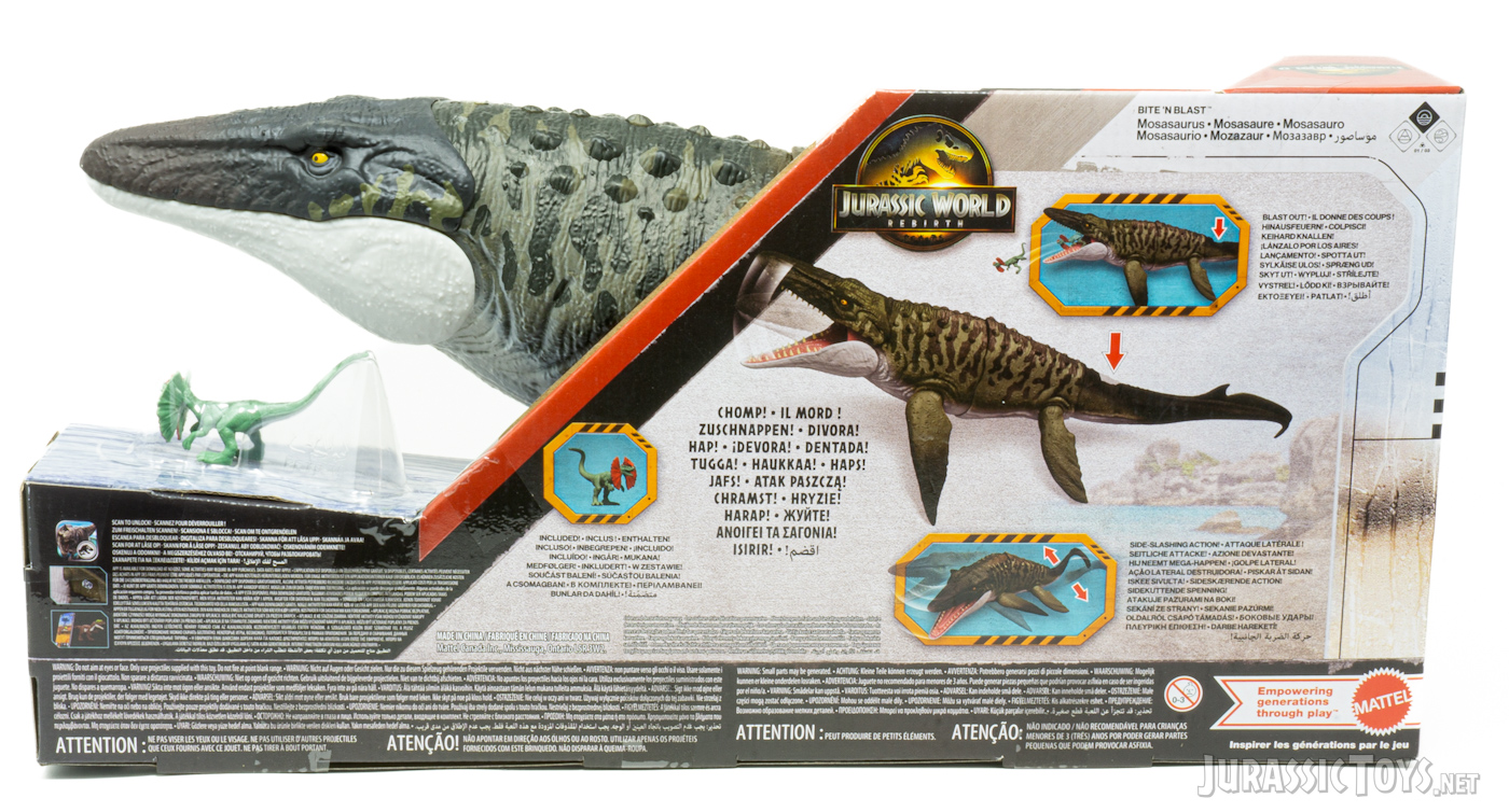 The Mosasaurus Bite ‘n Blast is a new version of the aquatic creature measuring over 65 cm in length. By holding the tail and pressing the button, the jaws open wide to bite and completely swallow the included mini Dilophosaurus figure. Pressing the button again triggers the blast feature, ejecting the prey in dramatic fashion.
