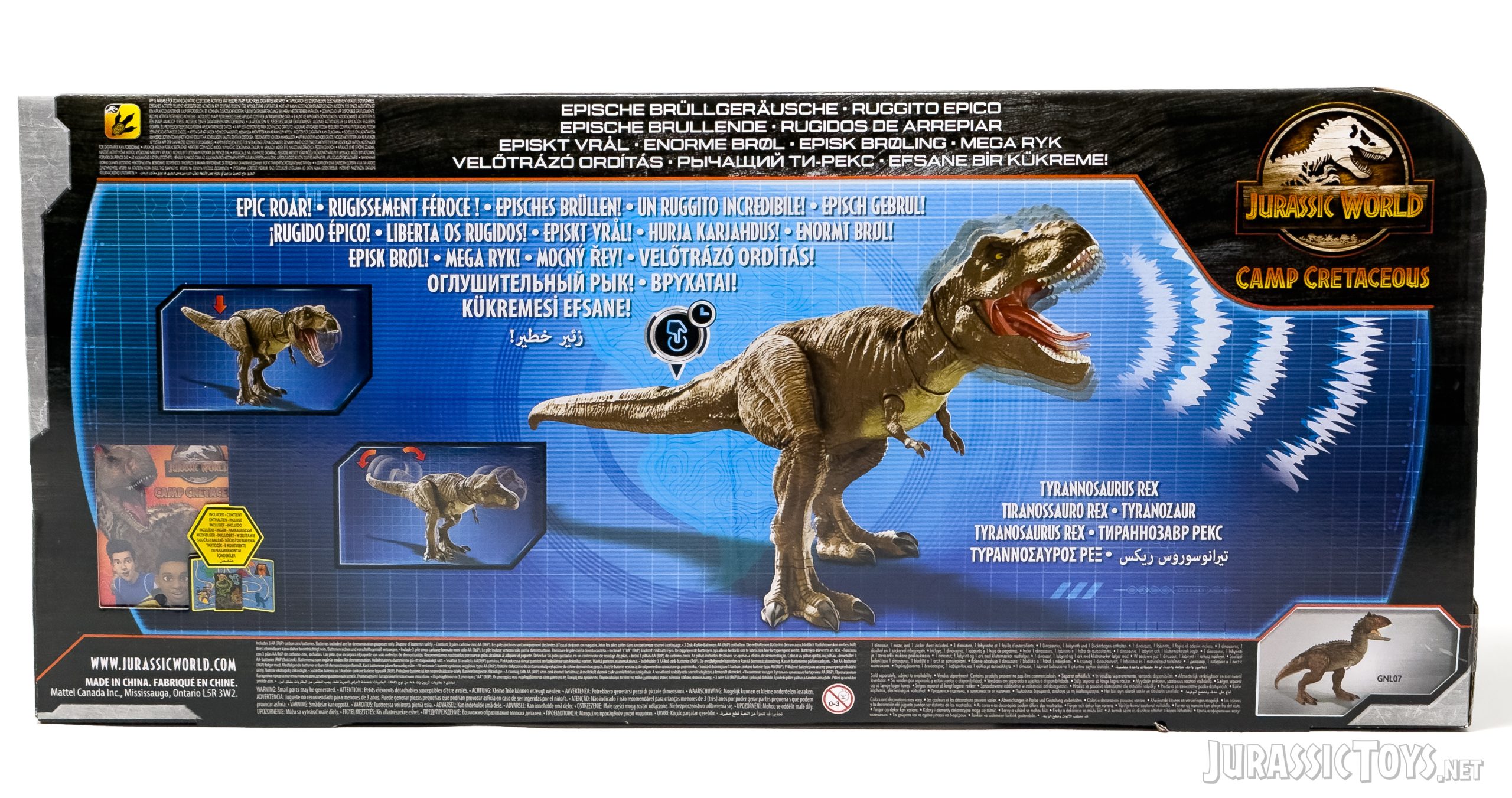 The Jurassic World Primal Attack Epic Roarin’ Tyrannosaurus Rex is a large-scale action figure released in 2020, inspired by the Camp Cretaceous animated series, featuring dynamic head swings, body twists, and chomping jaws. A tail button triggers an epic roar sound effect paired with realistic body shaking, complemented by authentic sculpting, movable joints, battle scars, and textured details