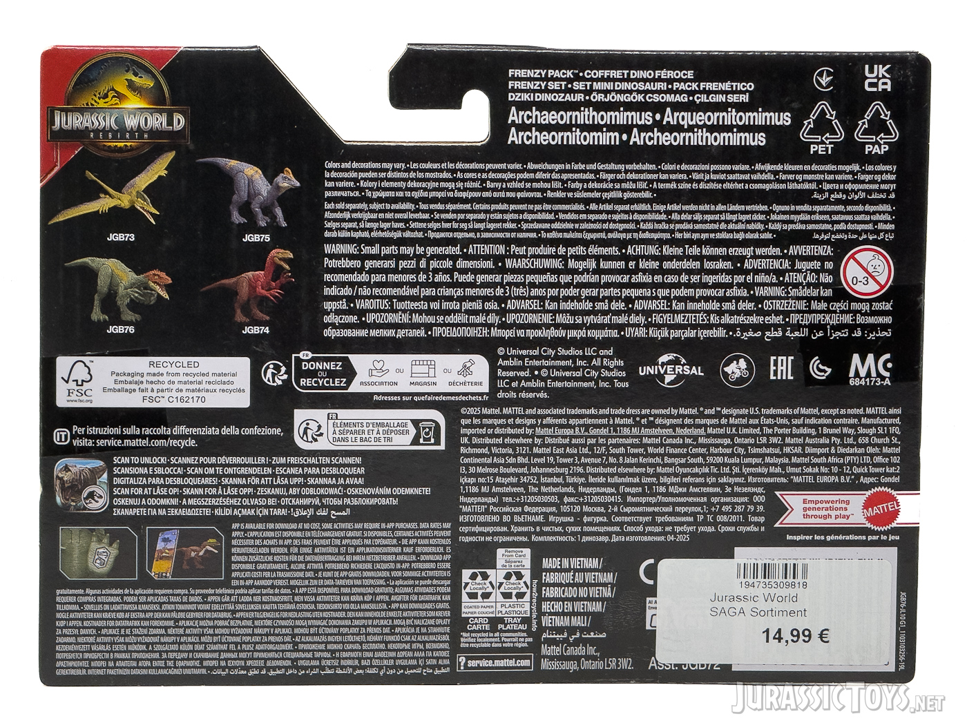 The Frenzy Pack assortment features small-scale dinosaur figures with basic articulation, ideal for younger fans or quick display setups. Similar in concept to the earlier Attack Pack figures, this wave introduces all-new species such as Iani and Archaeornithomimus, while also bringing back popular sculpts like Proceratosaurus and Herrerasaurus from previous lines.