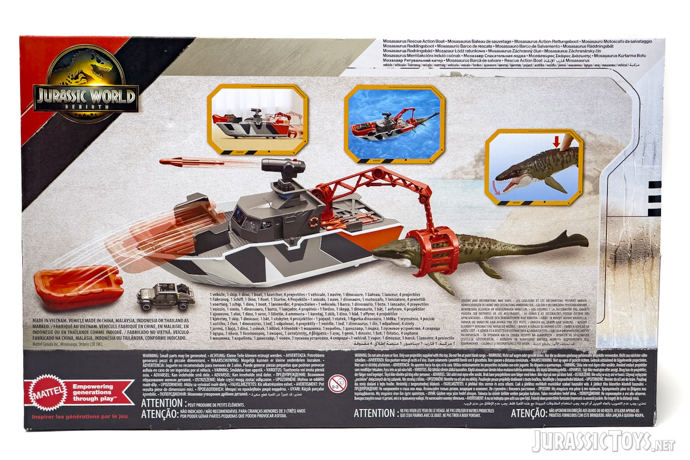 The Matchbox Jurassic World Mosasaurus Rescue Action Boat is a playset produced by Mattel and inspired by scenes from the 2025 film Jurassic World Rebirth. It features the main vessel equipped with a functional winch for capturing the included Mosasaurus figure, which has an articulated jaw and movable fins, along with a missile launcher, two harpoon missiles, wheels for land mobility, and water-floating capability. Additional components include a detachable orange rescue raft and a 1:64 scale die-cast Jeep for expanded play scenarios simulating aquatic and terrestrial operations.