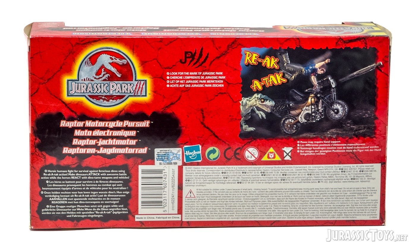 The Raptor Motorcycle Pursuit from the 2001 Jurassic Park III Hasbro toy line pairs an Alan Grant figure with a female Velociraptor and a detailed dirt bike. The bike showcases action features including a firing missile, spring-loaded ejection seat, and three-step electronic sound effects activated by manipulating the front end or triggering the “Re-Ak A-Tak” mode—where the seat pops up and emits raptor screeches to simulate an ambush. Painted in greenish-brown hues with black highlights, grey tires, and InGen branding, the bike shows intentional scratches to evoke battle damage. The Alan Grant figure wears a blue shirt, dark green pants, brown gloves, a red bandana, and features additional leg articulation for posing. The inclusion of a female velociraptor sculpted with realistic bone-exposed “damage,” yellow eyes, and a stalking stance—whose head can be pressed to mimic a snapping attack—makes this set a dynamic entry in the Jurassic Park III collection, inspired by an unused sequence for the film.