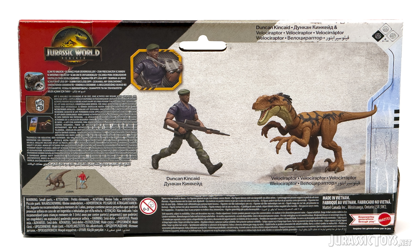 This story pack features Duncan Kincaid, the covert operations leader, paired with a Velociraptor figure in the same 3.75‑inch scale. Both figures are articulated and come with a gun and binoculairs.