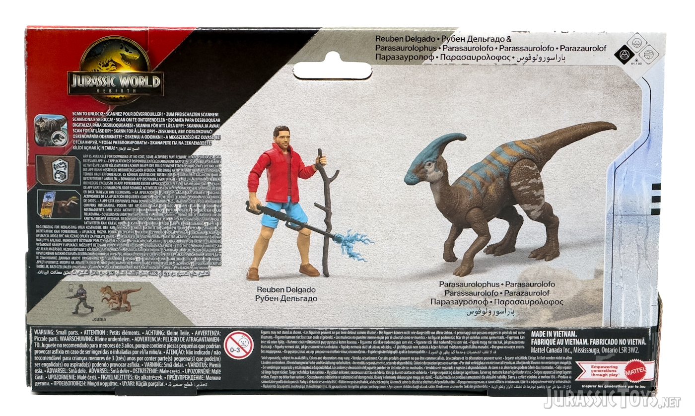 This story pack features Reuben Delgado, the shipwrecked father, paired with a Parasaurolophus figure in the same scale. Both figures are articulated and come with a cattle prod and walking stick.