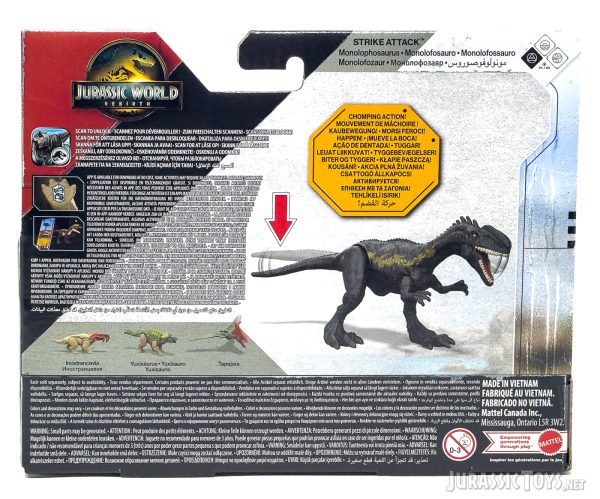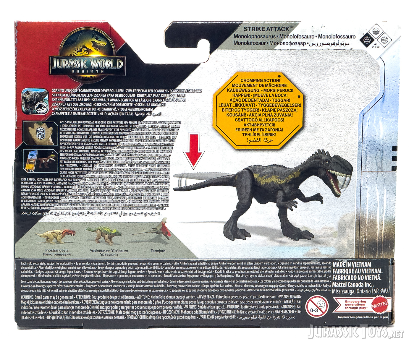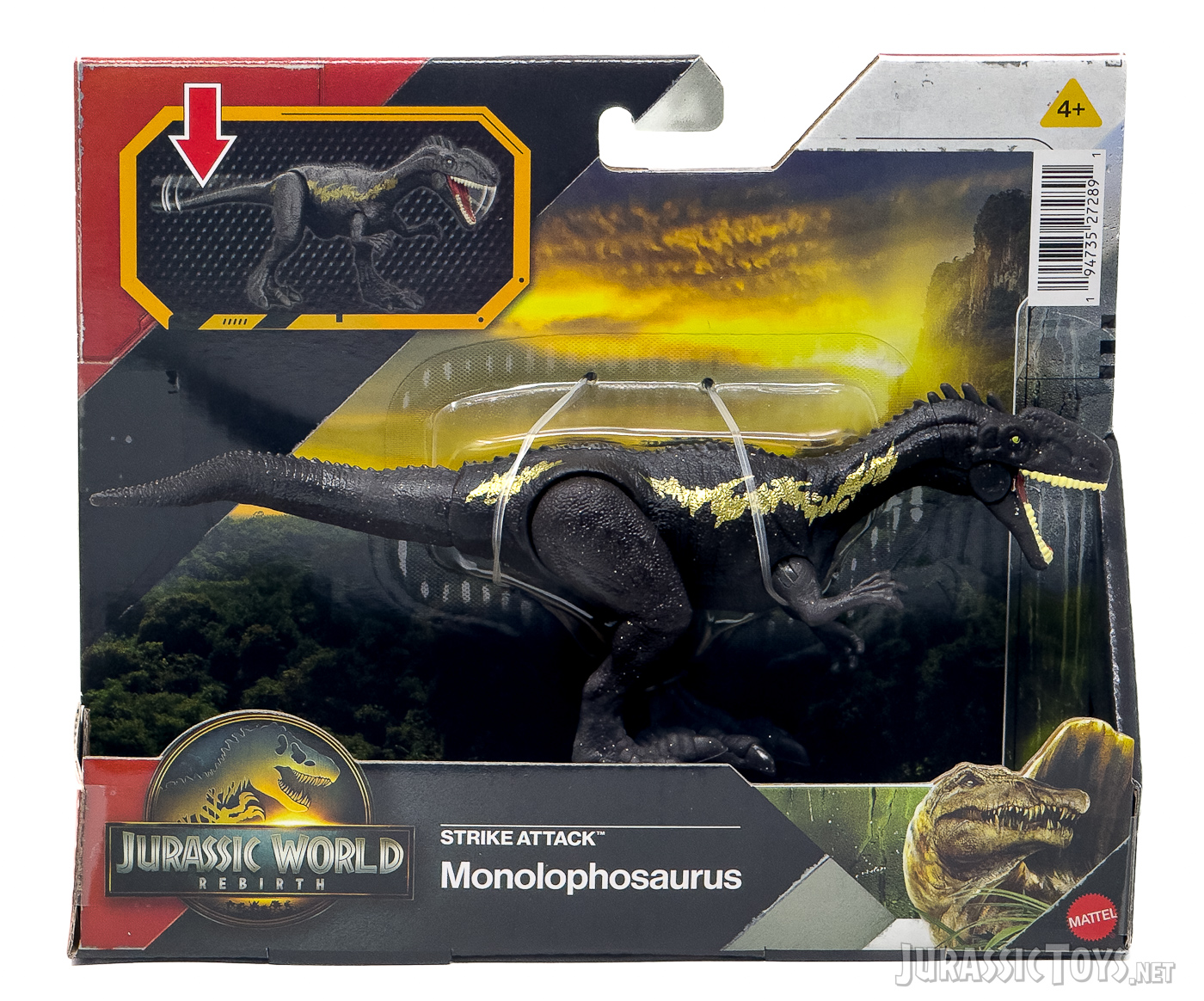 This Monolophosaurus sculpt, reused from previous Mattel Jurassic World lines, showcases a distinctive color pattern inspired by the Indoraptor.