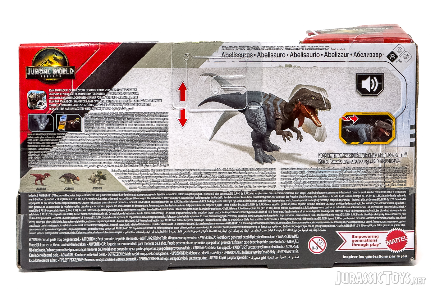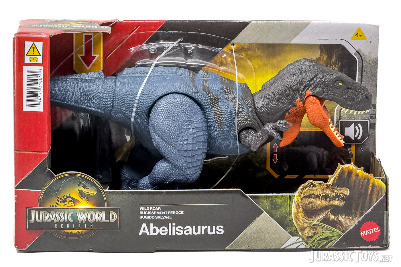 The Wild Roar assortment features mid-sized dinosaur figures equipped with articulation and built-in sound effects. Each dinosaur includes a species-specific roar and action movement, offering interactive play and screen-inspired realism. These figures also connect to the Jurassic World Facts app for added digital fun.