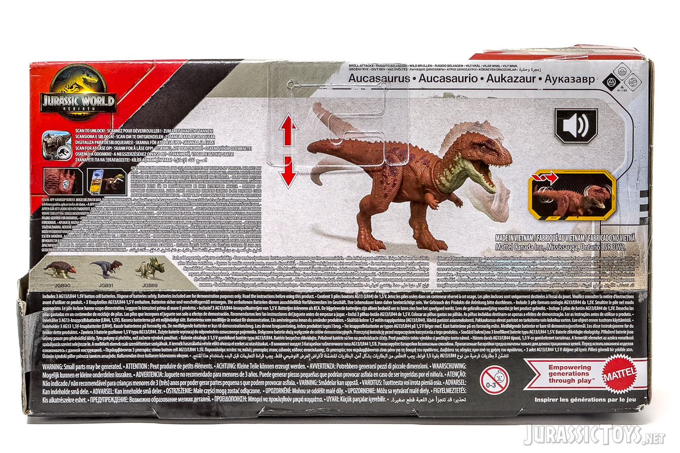 The Wild Roar assortment features mid-sized dinosaur figures equipped with articulation and built-in sound effects. Each dinosaur includes a species-specific roar and action movement, offering interactive play and screen-inspired realism. These figures also connect to the Jurassic World Facts app for added digital fun.